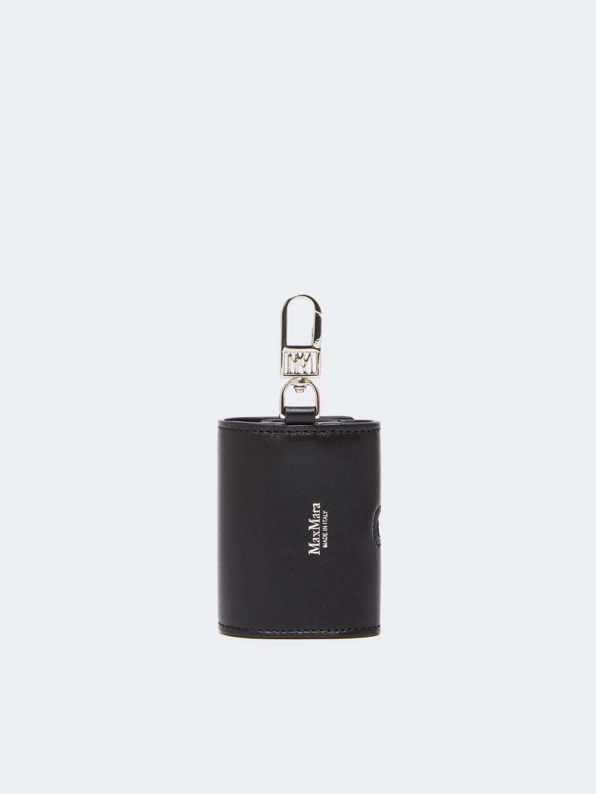 Etui für kabellose Airpods Pro Ohrhörer. Er ist mit einem kleinen laminierten Karabiner mit Monogramm ausgestattet und kann am MLace-Armband oder an den Taschen von Max Mara befestigt werden.